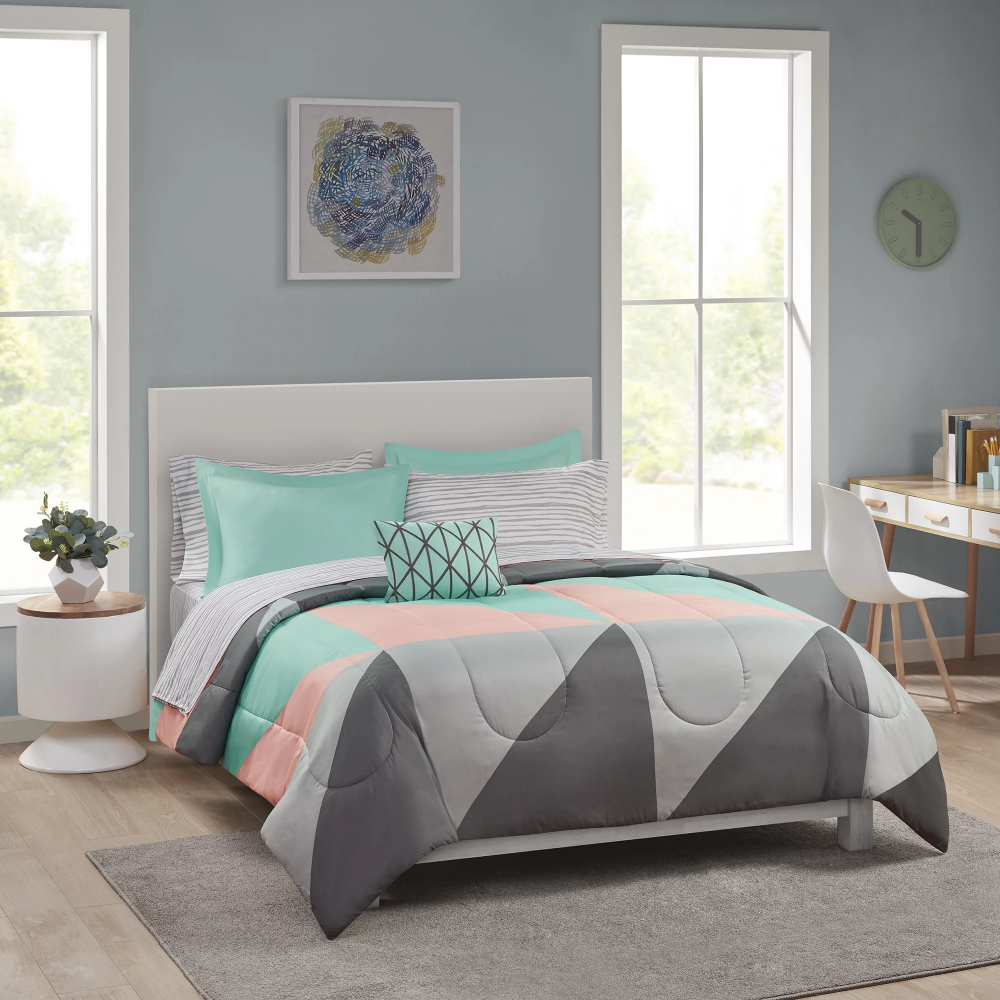 Gray and Teal Geometric 8 Piece Bed Bag Comforter Set